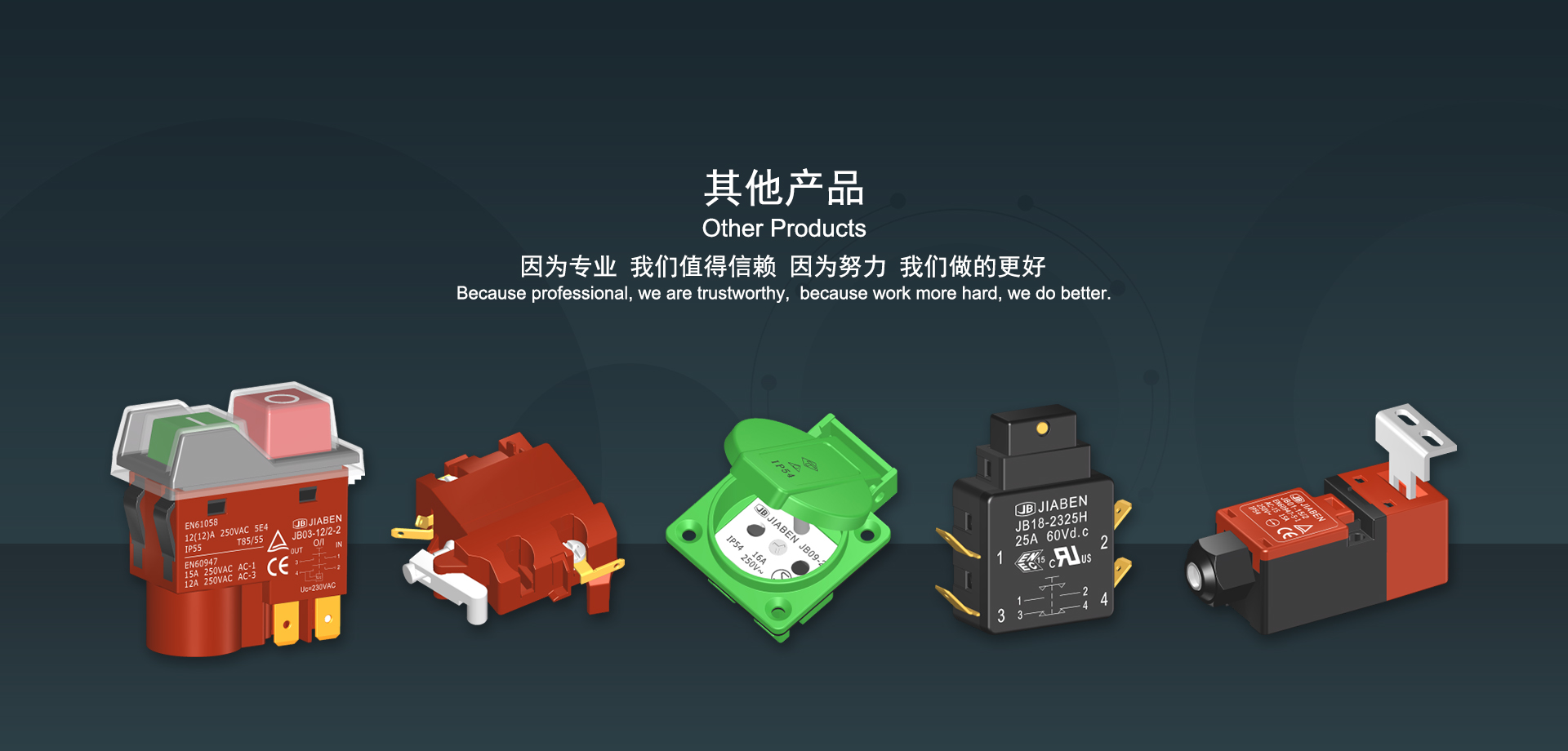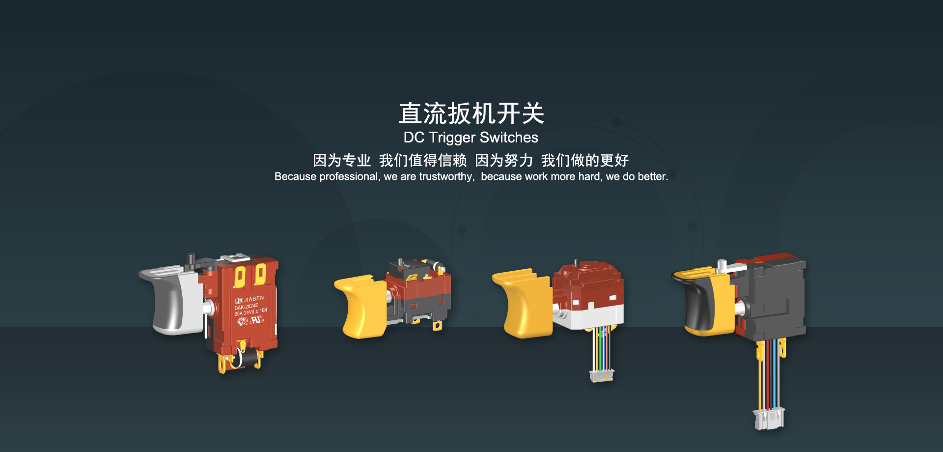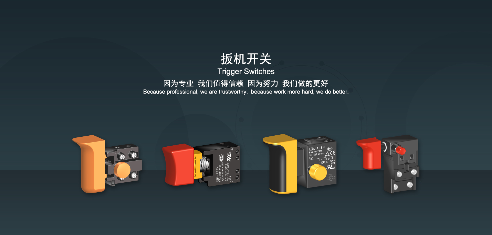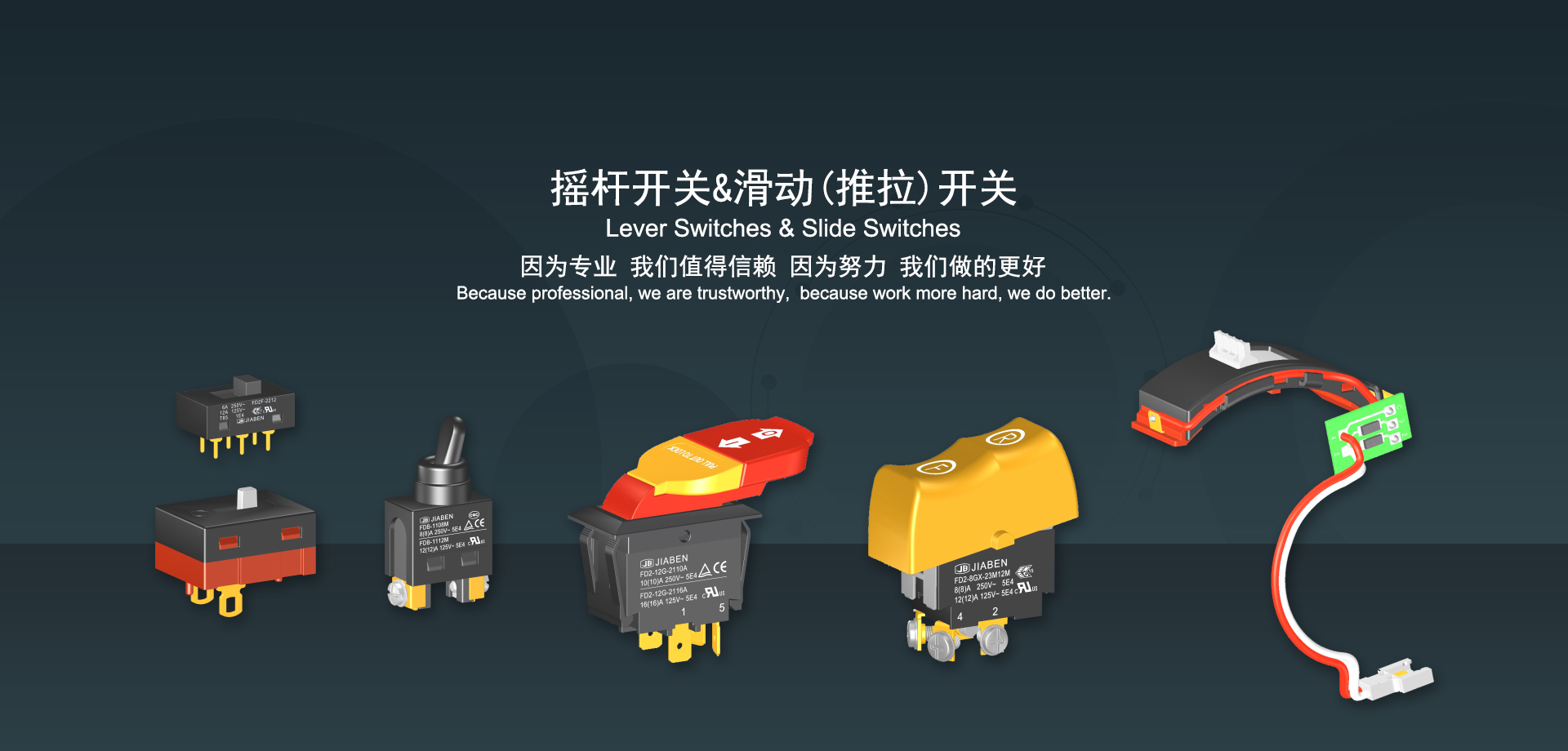 浙江佳奔電子有限公司始建于1986年,坐落于浙江省樂清市虹橋鎮東電子信息產業園內,現有職工700多人,資產總額超3億元。公司主要經營“JIABEN”牌微動開關、蹺板開關、按鈕開關、扳機開關、調速開關和電位器開關等各類交、直流器具開關和各類交、直流線路板模塊等產品,主要應用于交、直流電動工具、電動園林工具、清潔器具、家用電器和小型機床等行業,是集產品設計、研發、制造、銷售和服務于一體的國家高新技術企業。JIABEN was founded in 1986, located in East Electronic Information Industry Park, Hongqiao Town, Yueqing City, Zhejiang Proviance, existing staff more than 700 peoples, more than 300 million RMB worth of assets. Company is mainly engaged in "JIABEN" brand Micro Switch, Rocker Switch, Push-button Switch, Trigger Switch, Speed Regulating Switch, Potentiometer Switch and other kinds of appliance switch and all kinds of AC or DC circuit board module, such as more than 100 series, 8000 kinds of models of products, mainly used in AC or DC Power-tools, Power Gardening Tools, Cleaning Appliances, Household Appliances and Small Machine Tool and other industries, is the collection product design, research and development, manufacturing, sales and service in one of the national high and new technology enterprise.